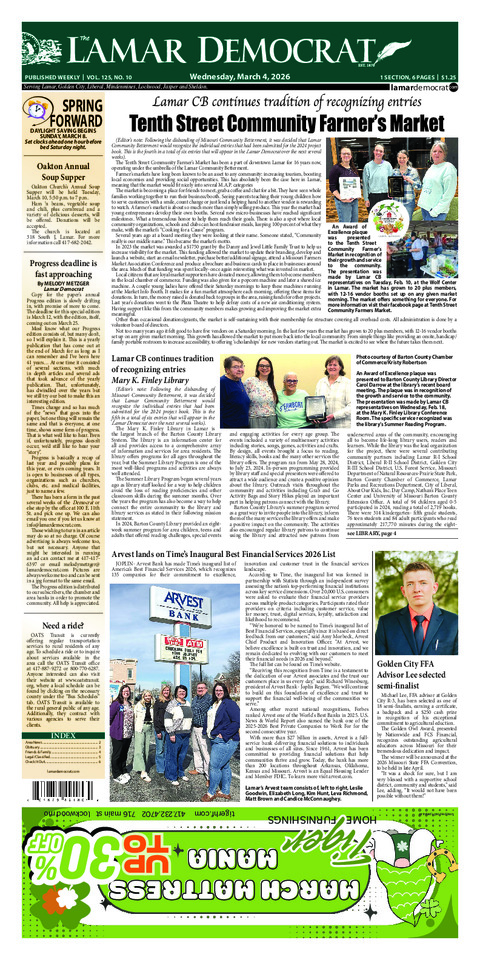 JOPLIN- Arvest Bank has made Time’s inaugural list of America’s Best Financial Services 2026,...